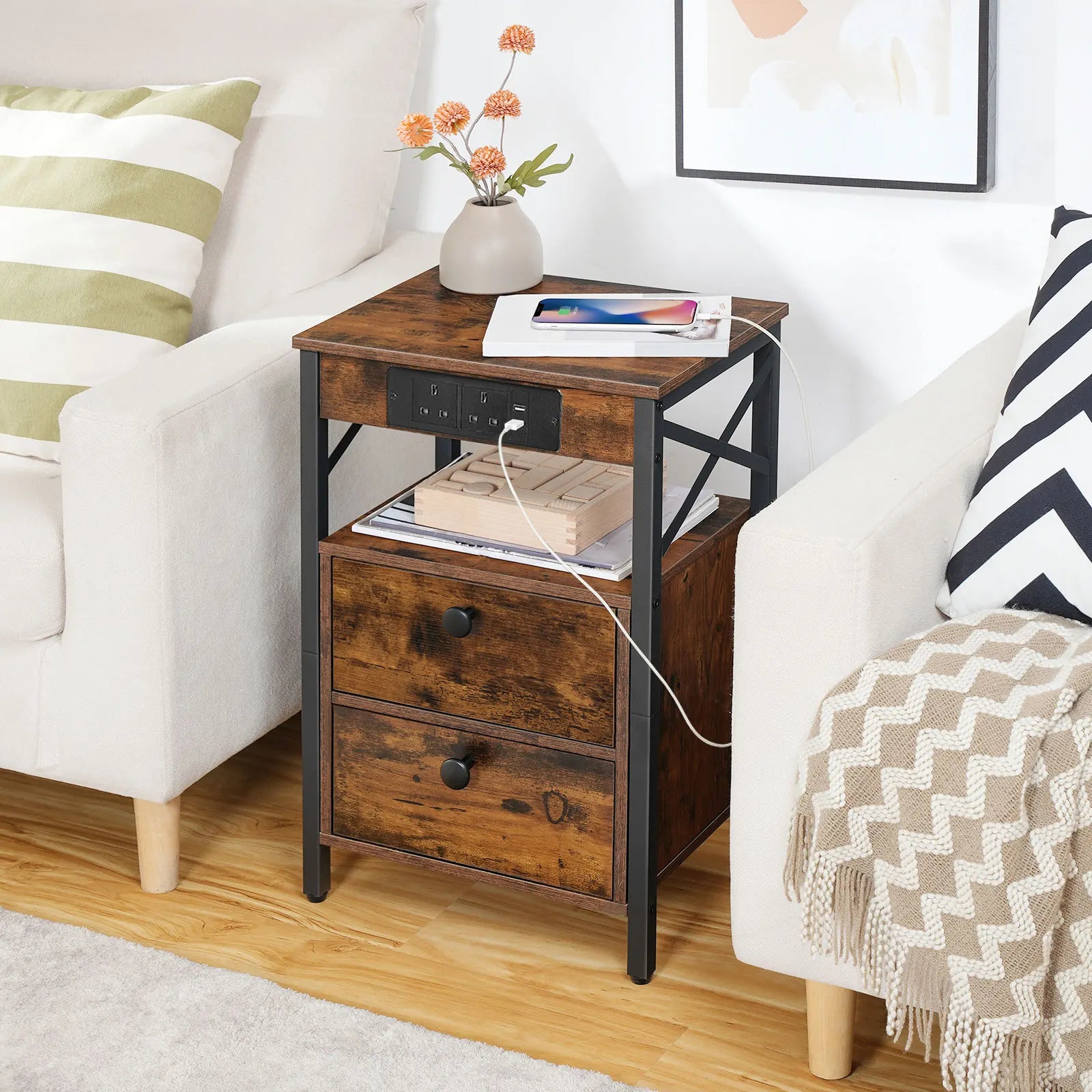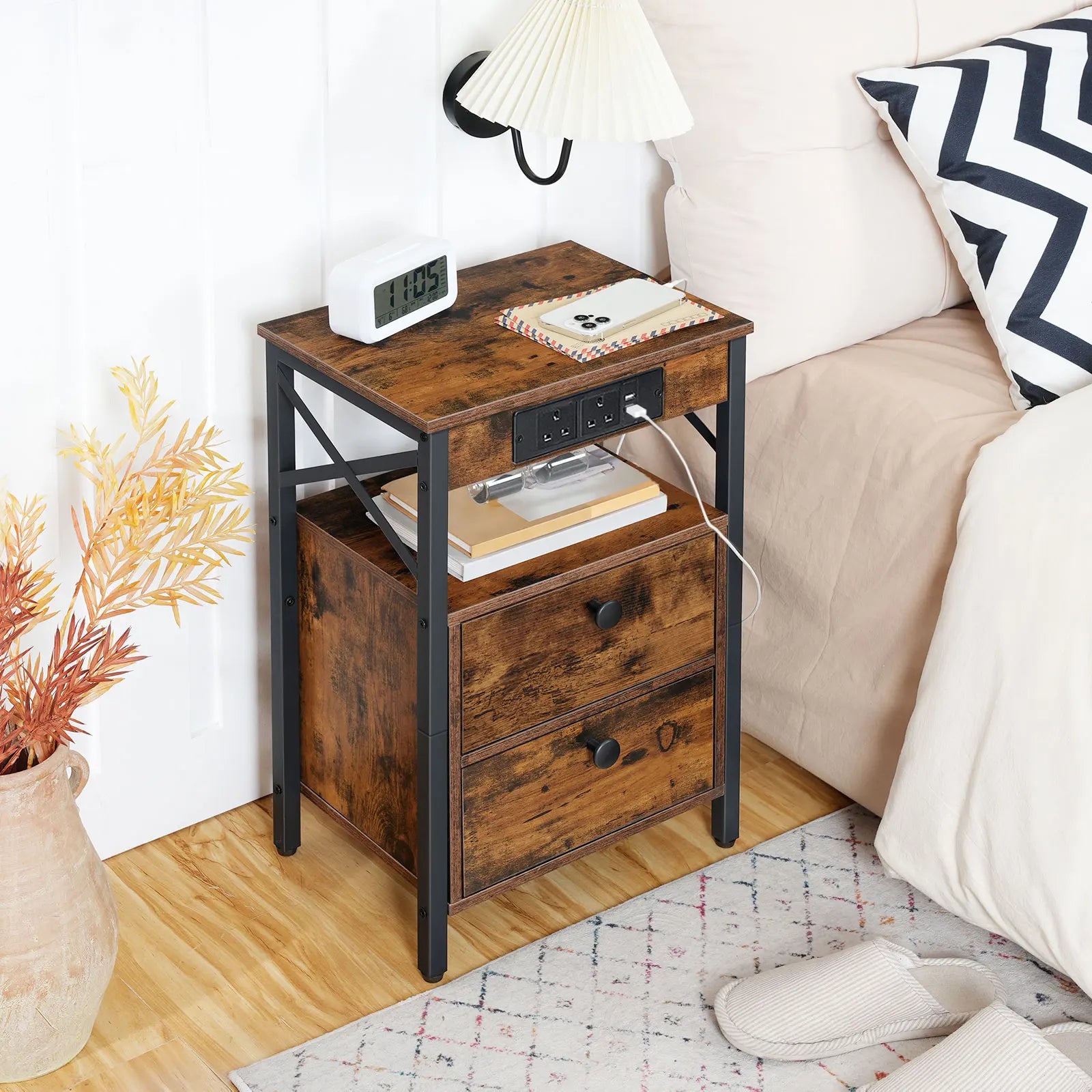 HOOBRO Rustic Brown Bedside Table with Charging Station & USB Ports