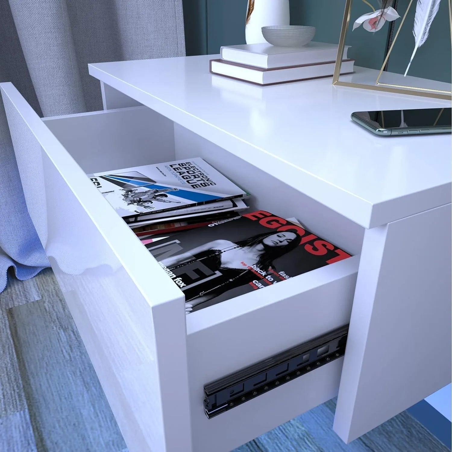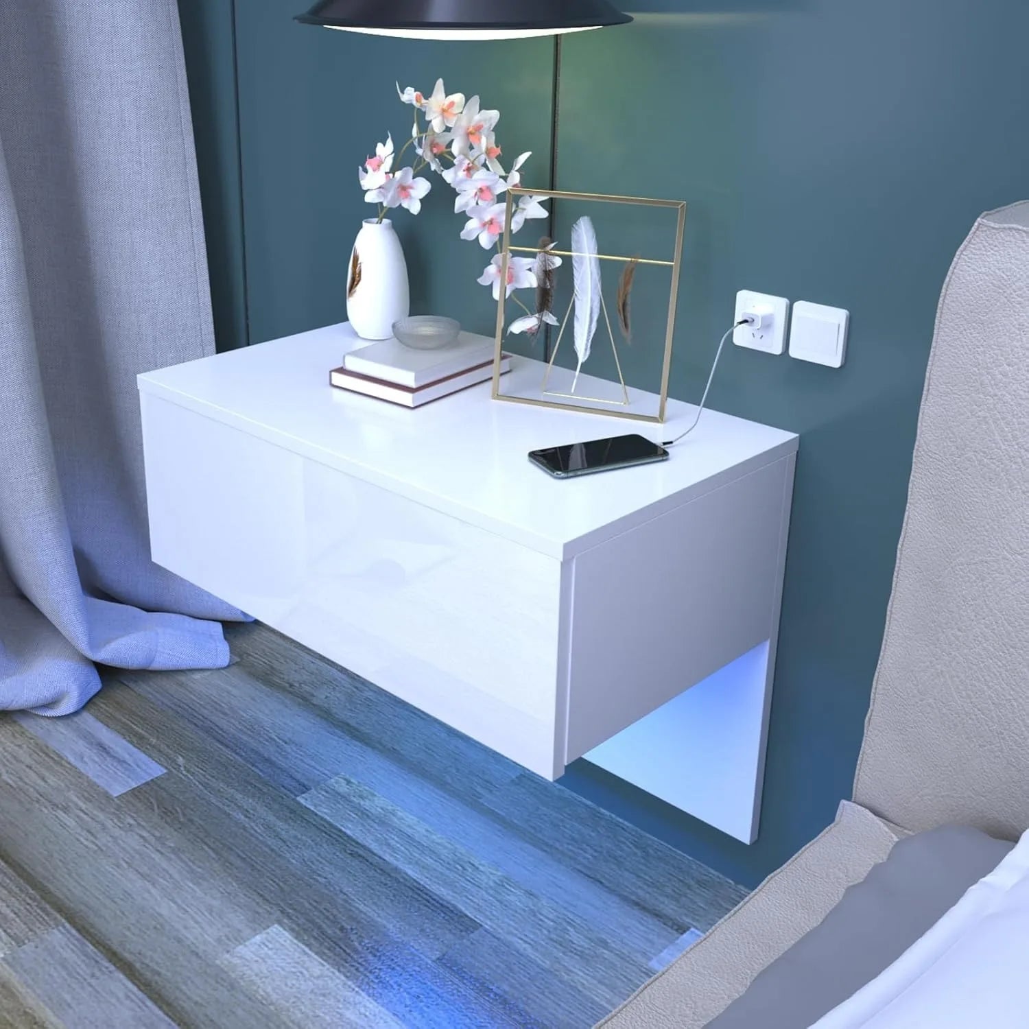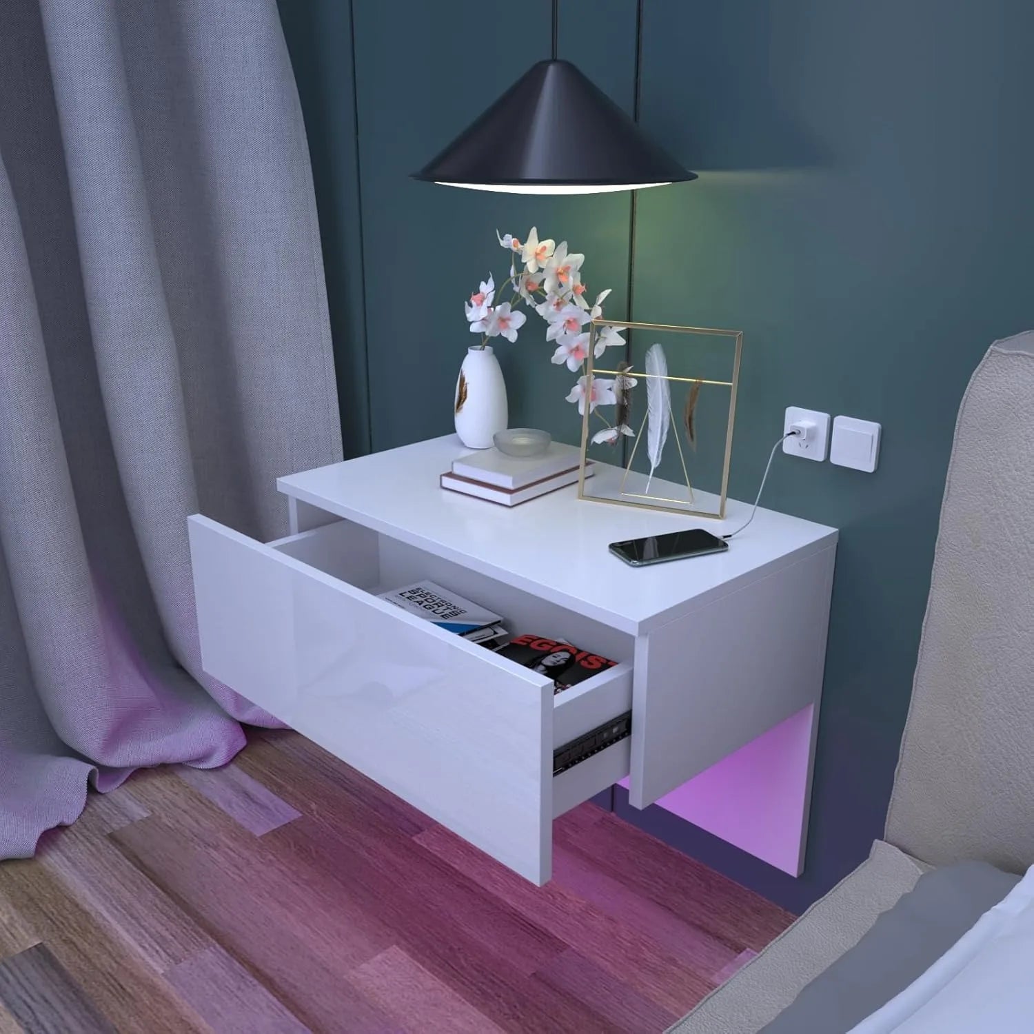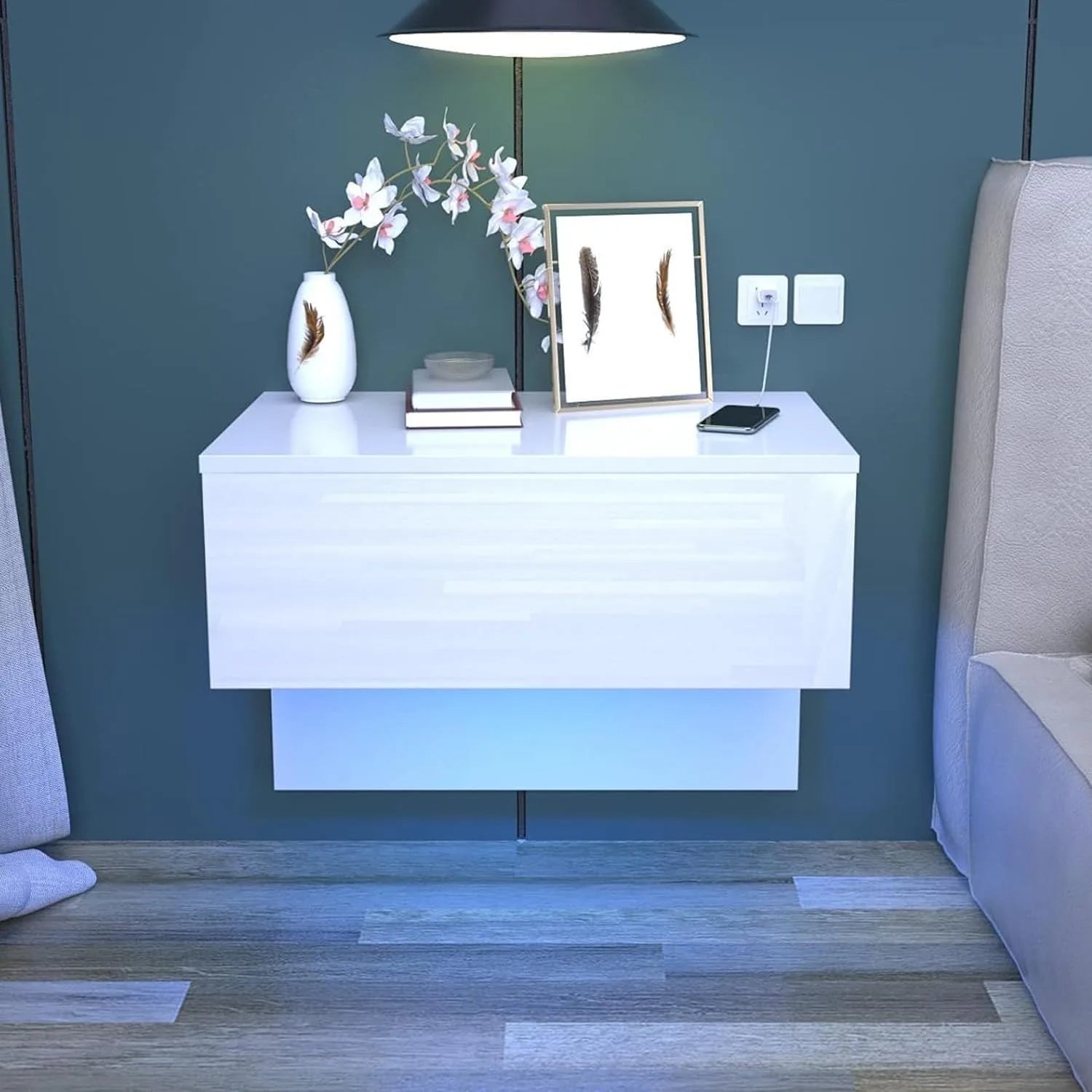 Modern Floating Bedside Table with RGB LED Lights - Cream White